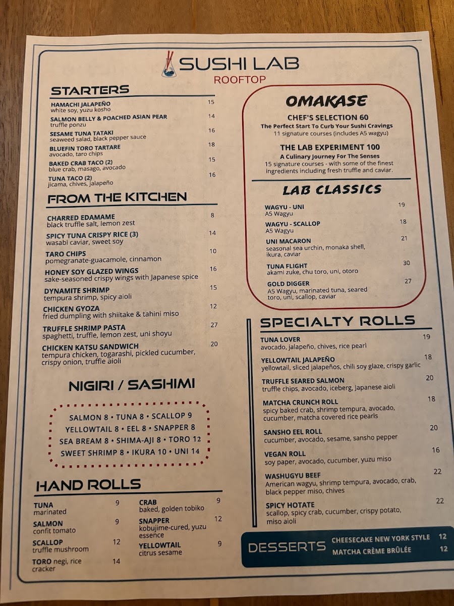 Specialty rolls like the Seared Salmon and Matcha Crunch Roll promise bold flavors and innovative ingredients. Enhance your meal with unique cocktails such as the refreshing Mikan Sunrise. With its elevated atmosphere and attentive service, Sushi Lab Rooftop sets the stage for unforgettable evenings whether it's a romantic date or a celebratory gathering.